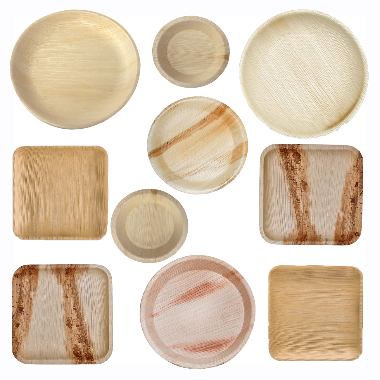 - Areca leaf plates (round, square, oval)